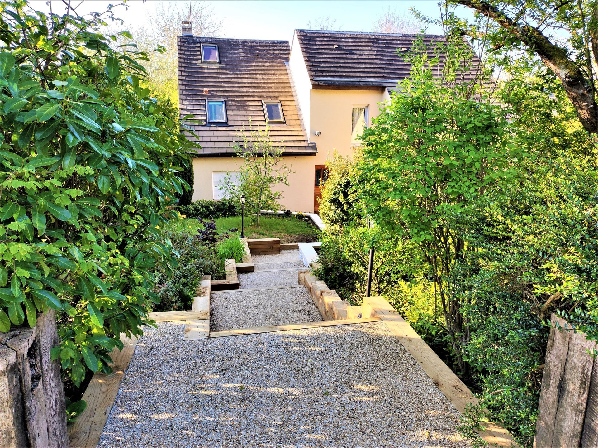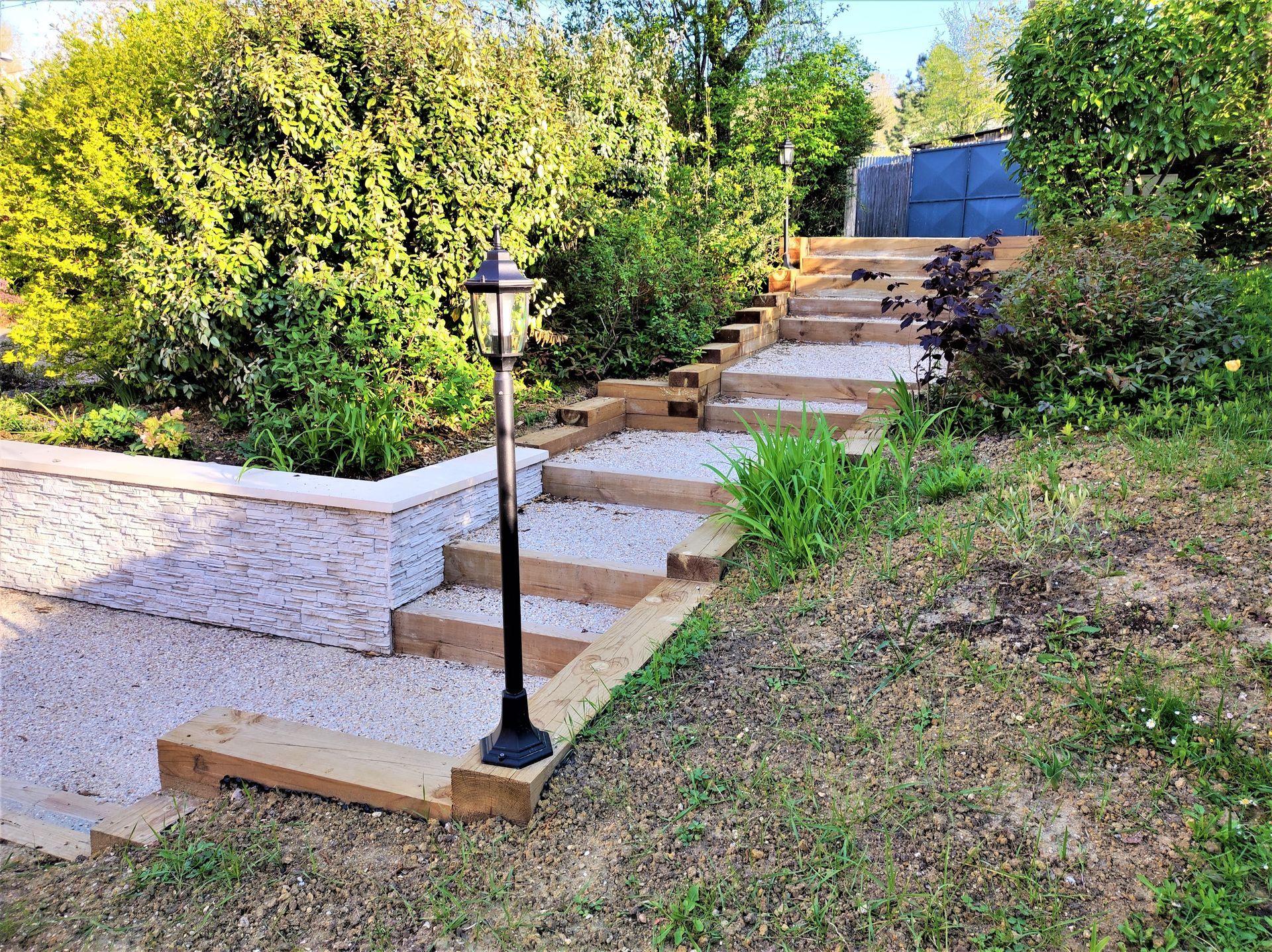 Une réalisation signée par nos équipes, conçue pour mêler le charme chaleureux du bois à la sécurité du béton désactivé antidérapant, tout en assurant un maintien parfait de ce terrain particulièrement pentu.