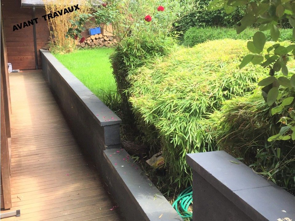 Création d’un cheminement entièrement repensé : bambous retirés, reprise maçonnée du muret, réalisation d'une allée gravillonnée, plantations et engazonnement réalisés par nos équipes pour transformer l’espace et révéler tout son potentiel.