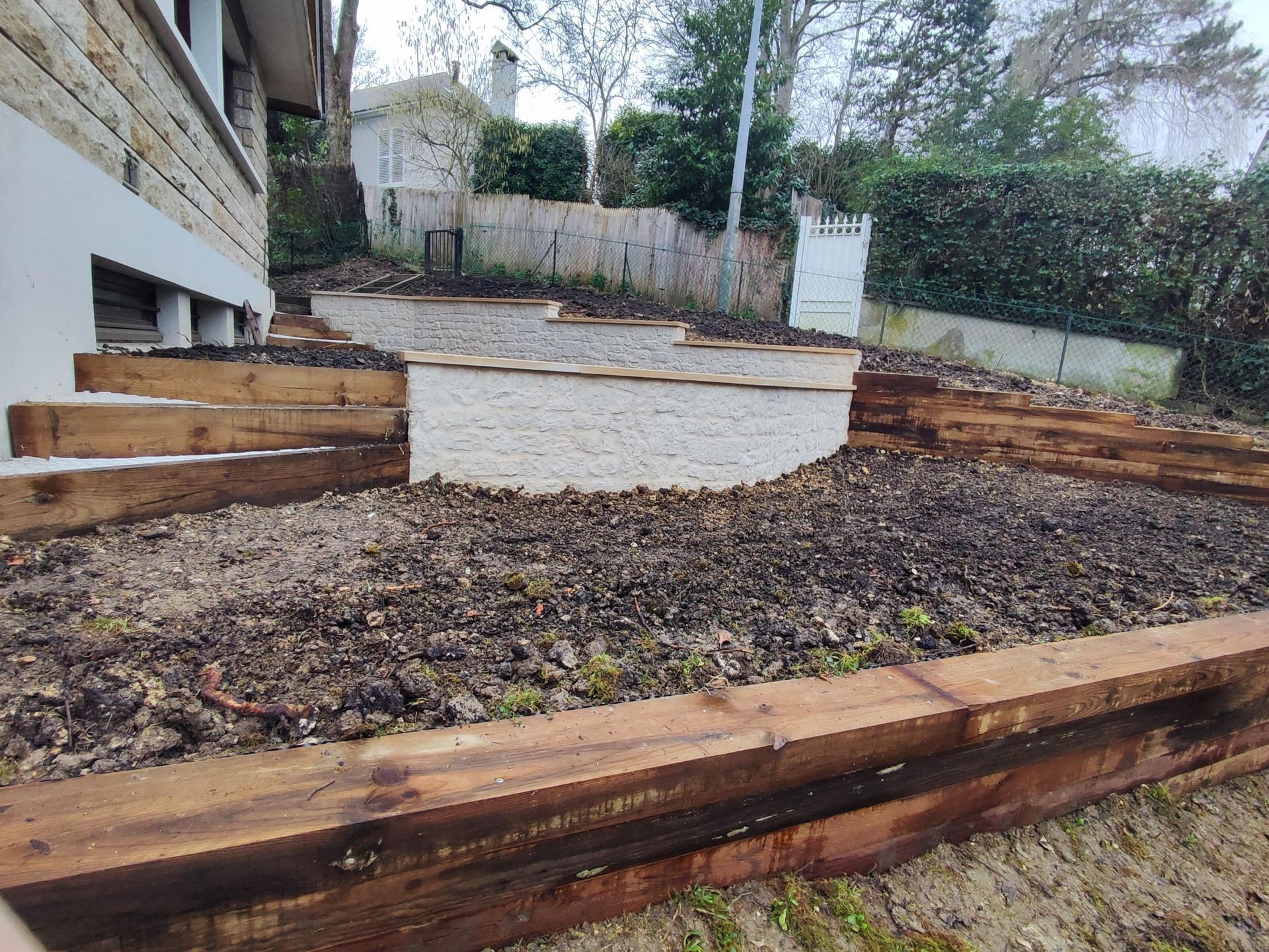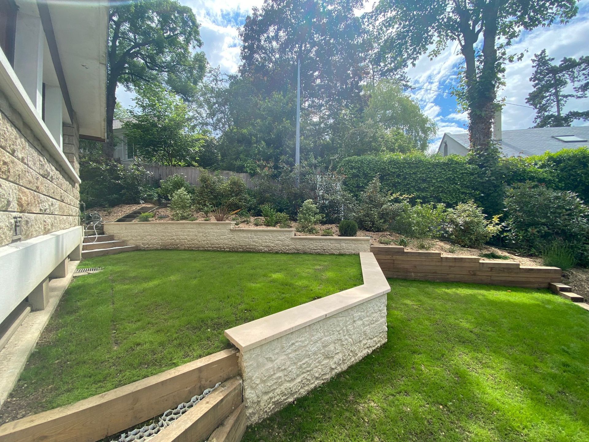 Nos équipes ont profondément nivelé le terrain pour créer deux espaces parfaitement plats. Elles ont ensuite planté une haie en deux niveaux : un rempart d’arbustes persistants pour se protéger de la voie publique, adouci par une bordure fleurie et colorée qui transforme les terrasses en véritable cocon végétal.