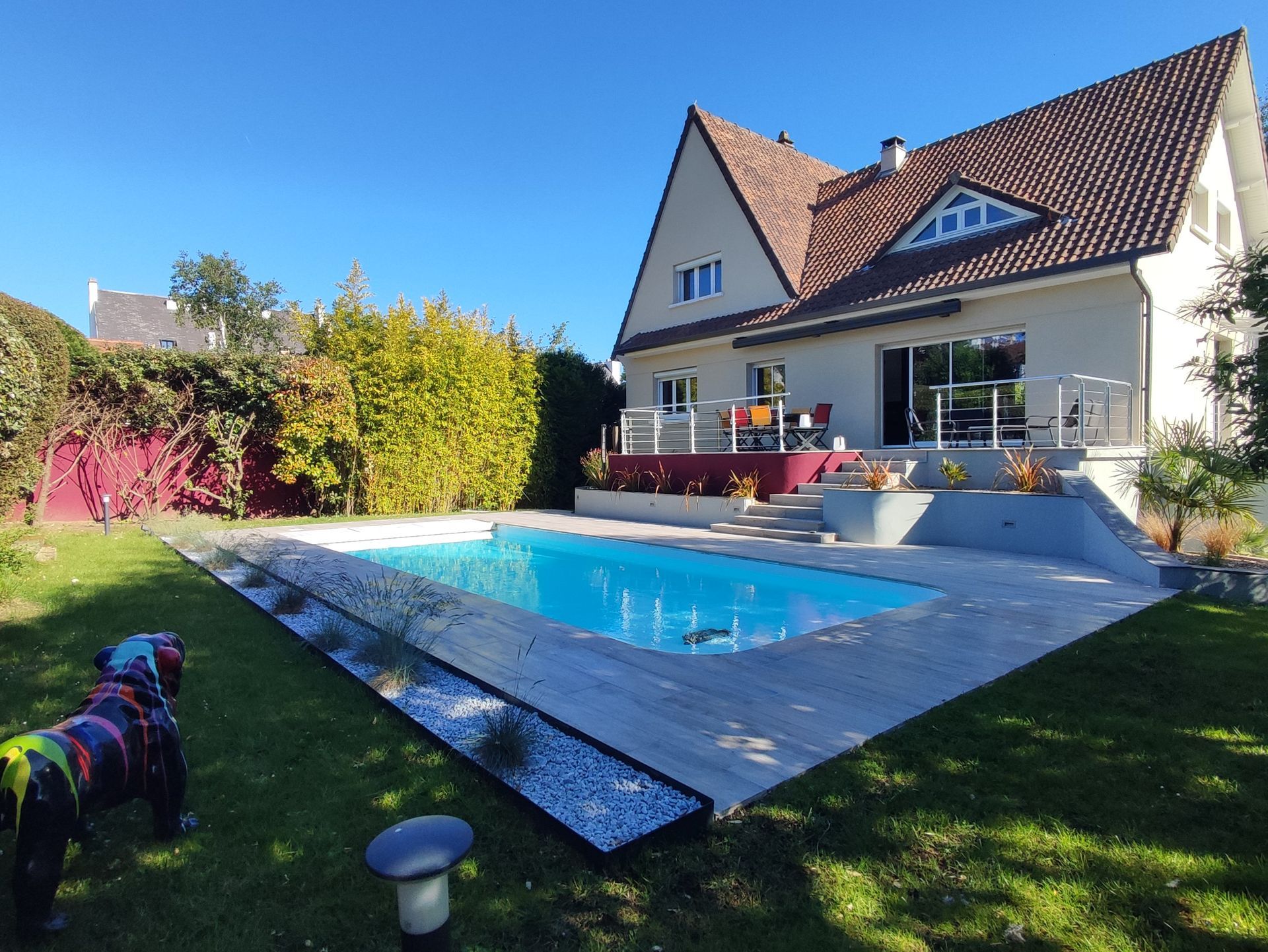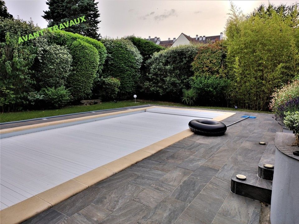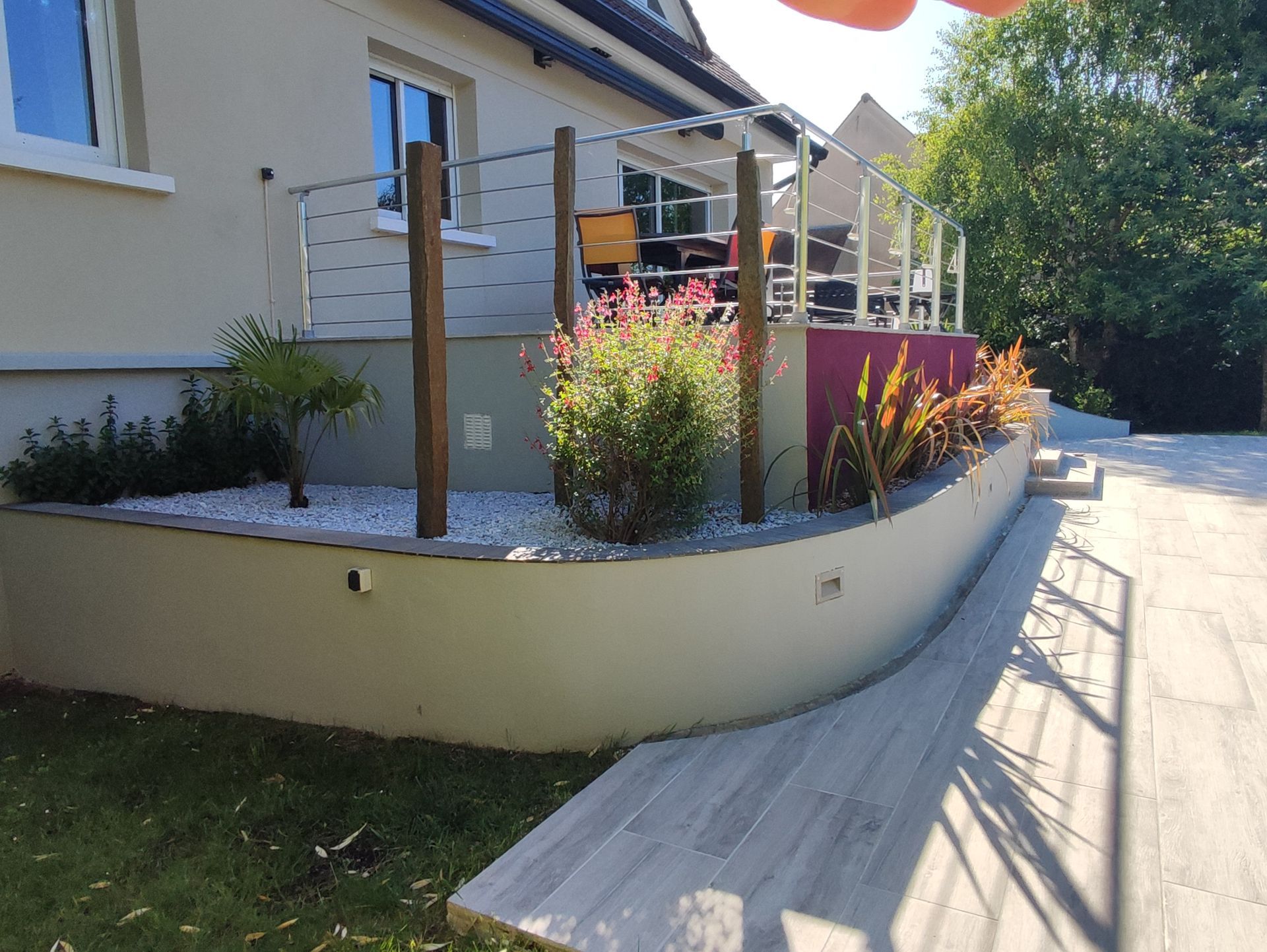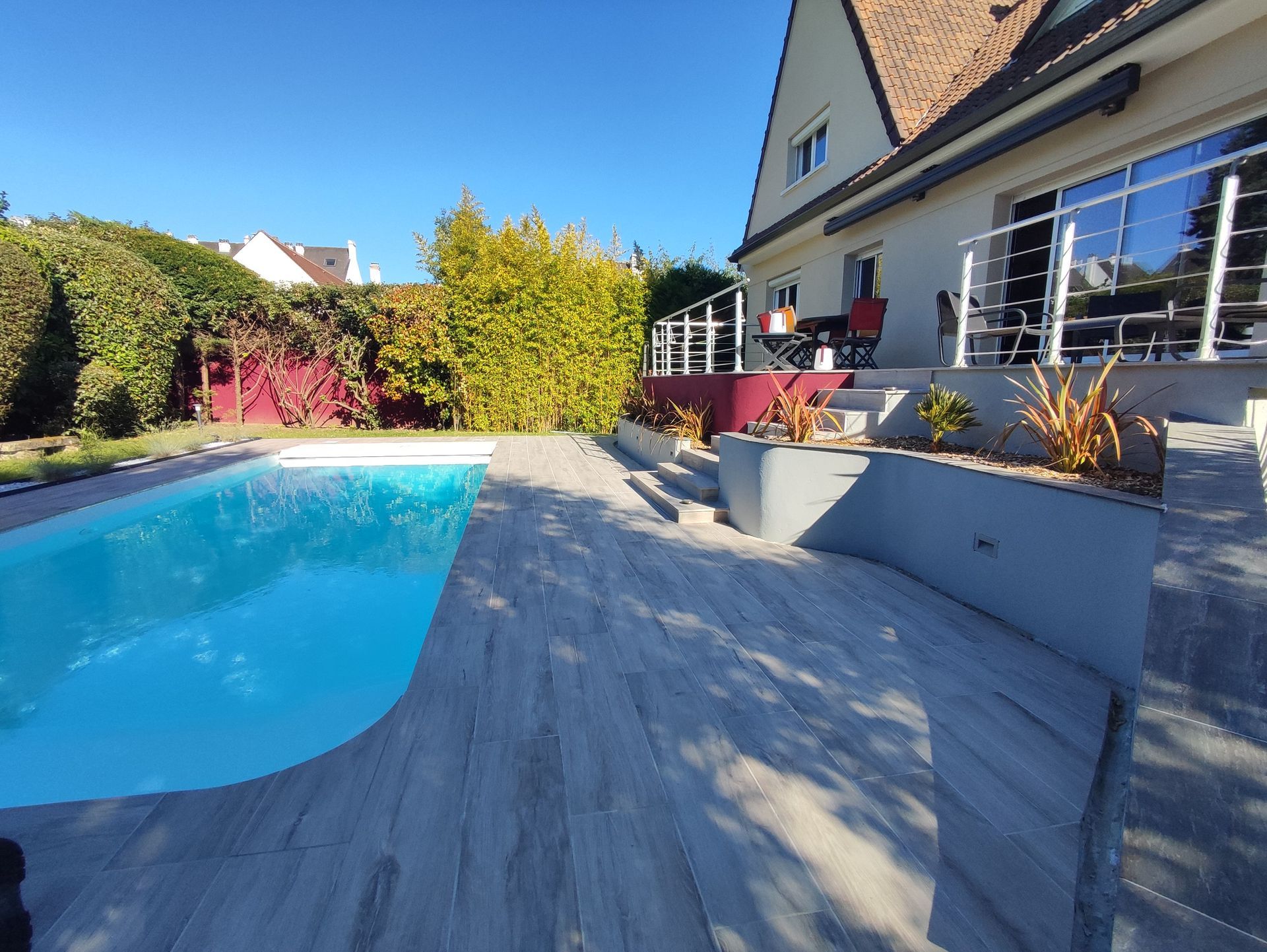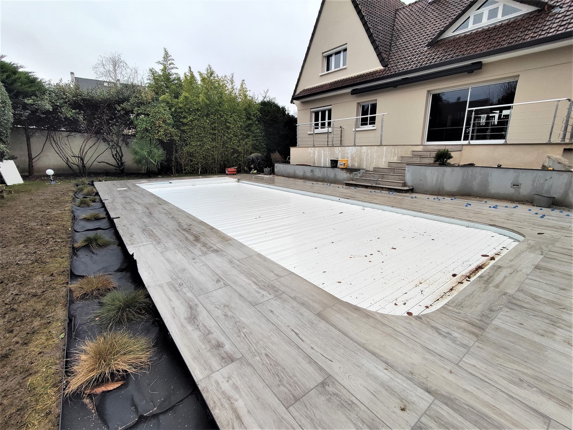 Abélia a entièrement repensé la terrasse en supprimant les anciennes margelles, peu modernes, et en posant un carrelage contemporain.